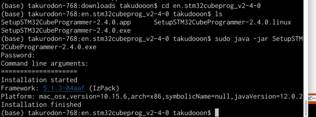 2. ターミナルから下記のコマンドを実行することでインストールすることができました。ダウンロードしたフォルダにcdで入り、java -jarで実行します。
