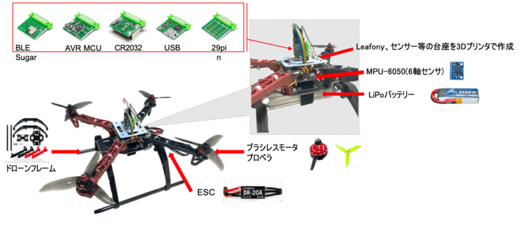 ドローンをフライトコントローラとしてナノコン(Leafony)を活用しドローンの制御を実現しました。