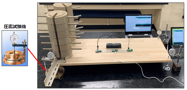 次に、先ほどの実験台の片側のアジャスターボルトを、粘土を詰めた圧密試験機に変えて上から錘を載せ、徐々に沈下させることで自然に傾斜していく状態を再現しました。その状況をWi-Fi通信を利用してGoogleスプレッドシートに送り、遠隔地でも傾斜の状態をリアルタイムに監視できることを確認しました。