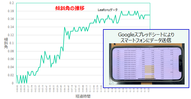 下図は、実験の様子と、傾斜角の経時変化(0分~22分)ならびにデータが送信されたスマートフォン画面を示しています。